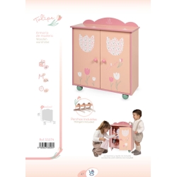 Inclui: 1 roupeiro de madeira para bonecas serigrafado com um design especial da linha Tulipe cor-de-rosa, duas portas com dobradiças, três cabides de madeira e muitos mais pormenores de luxo.