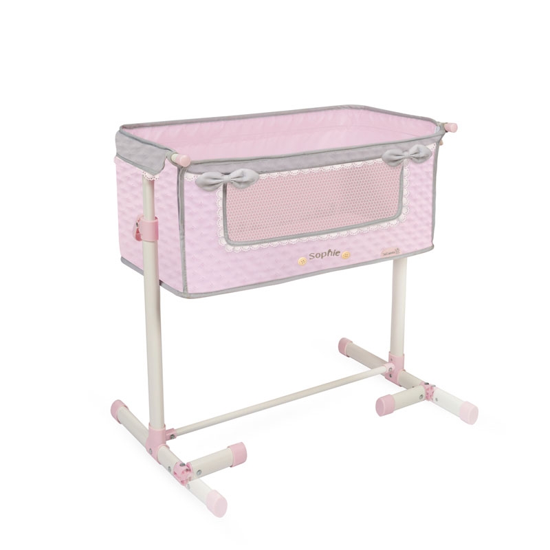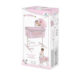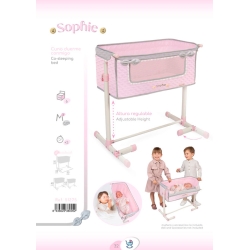Inclui: 1 berço para bonecas Dormindo Comigo da coleção Sophie em cor-de-rosa com detalhes em cinzento, estrutura regulável em altura, tecido acolchoado, laços acolchoados, botões decorativos de madeira, detalhes bordados e muitos mais detalhes de luxo.