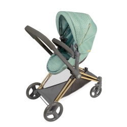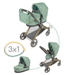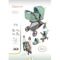Inclui: 1 carrinho de bonecas Capriccio verde e preto com design 3 em 1, convertível em cadeirinha de passeio e alcofa, estrutura dobrável, rodas dianteiras giratórias, cinto de segurança tipo arnês, bandeja inferior para objetos, tecido acolchoado e liso combinado, parte da estrutura cromada, mala a condizer e mais detalhes de luxo.
