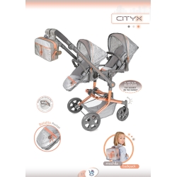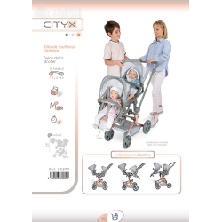 O pack inclui: carrinho para bonecas gémeos cinzento com estrutura dobrável, tabuleiro inferior em tecido, rodas dianteiras giratórias, rodas silenciosas com pneus em espuma, guiador almofadado ajustável em altura, saco para carrinho a condizer e mais detalhes de luxo.
