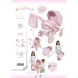 Inclui: 1 carrinho de bonecas 3 em 1 da linha Sophie em cor-de-rosa com detalhes em branco e cinzento, convertível em cadeirinha ou porta-bebés com estrutura dobrável, guiador regulável em altura, rodas dianteiras giratórias, tecido acolchoado, laços acolchoados, detalhes bordados, botões decorativos em madeira natural, rodas com revestimento em espuma, capa com pequeno compartimento, mala a condizer com pegas em madeira natural, tabuleiro em tecido a condizer para objectos.