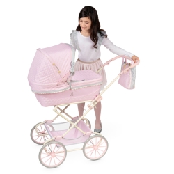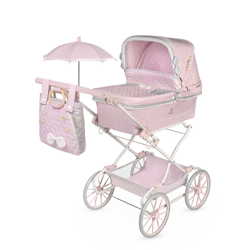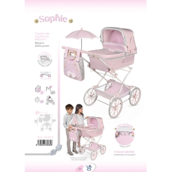 Inclui: 1 carrinho de bonecas da linha Sophie em cor-de-rosa com detalhes em branco e cinzento, estrutura dobrável, guiador regulável em altura, suspensão, laços acolchoados, detalhes bordados, botões decorativos em madeira natural, mala a condizer com pegas em madeira natural, guarda-sol, rodas grandes com revestimento em espuma, tecido acolchoado, tabuleiro de arrumação, capota com tensores, colchão, manta, capa com pequeno compartimento e muitos mais detalhes de luxo.