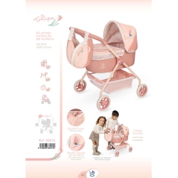 Inclui: 1 o meu primeiro carrinho de bonecas da coleção Tulipe em cor-de-rosa com estampado especial de tulipas, mala com design a condizer, tabuleiro em tecido, colchão, rodas com revestimento em espuma, pormenores bordados, capota com compartimentos laterais, capa com pequeno compartimento e muitos mais pormenores de luxo.