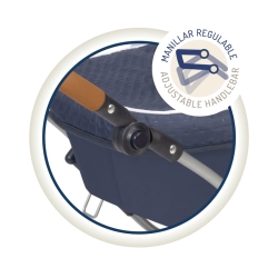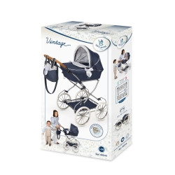 Inclui: 1 carrinho de bonecas Vintage azul e branco com estrutura dobrável, bandeja inferior, rodas grandes com revestimento de espuma, guiador regulável em altura, almofada, colchão, suspensão, tensores de capota, mala a condizer e muitos mais detalhes luxuosos.