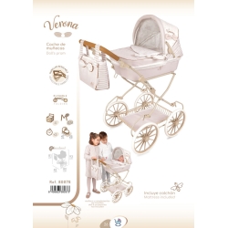 O pack inclui: Carrinho de bonecas branco e bege com estampado especial Verona, estrutura dobrável, tabuleiro de arrumação inferior, rodas grandes de estilo clássico com pneus com espuma silenciosa, guiador almofadado, alcofa rígida, capota com tensores, saco de carrinho a condizer e mais detalhes luxuosos.