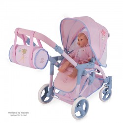 Fabricado com materiais de alta qualidade, a estrutura dobrável deste carrinho é feita de material leve, as rodas giratórias frontais são feitas de material de borracha que garante um deslocamento perfeito em todos os tipos de pavimento. Tem também um arnês para que os bonecos fiquem bem seguros durante a viagem.