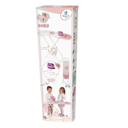 O pack inclui: Tábua de engomar branca e cor-de-rosa com design especial da Koala, estrutura dobrável, tabuleiro de tecido inferior, ferro de engomar de brincar e três cabides de plástico.