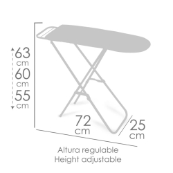 Medidas aproximadas: 63 cm de altura (ajustável a 60 ou 55 cm), 25 cm de largura e 72 cm de profundidade.